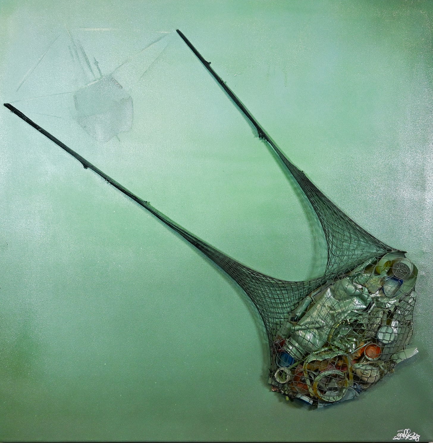 Nachhaltige Assemblagen - dieser Terminus beschreibt dieses Werk wirklich passend. Denn dieses dreidimensionale Werk hat die unsägliche Verschmutzung unserer Gewässer zum Thema. Der gesamte Müll, die Tuben und Aludosen, die Plastikdeckel- und flaschen, alles, das in diesem Schleppnetz gefangen ist, wurde vom Künstler aus dem Wasser gefischt und hier in diesem Werk verarbeitet. Ich bin mir durchaus bewusst, dass diese Collage keinen Auktionsrekord bei Sotheby´s erzielen wird, doch das ist mir egal. Denn es ist eine Arbeit eines jungen Künstlers, die ein unglaublich wichtiges Thema, nämlich die Verschmutzung unserer Wasserspeicher durch unseren Wohlstandsmüll, anspricht. Und dieses heikle Thema hat er aus meiner Sicht sehr gut umgesetzt - ich finde das Werk toll.